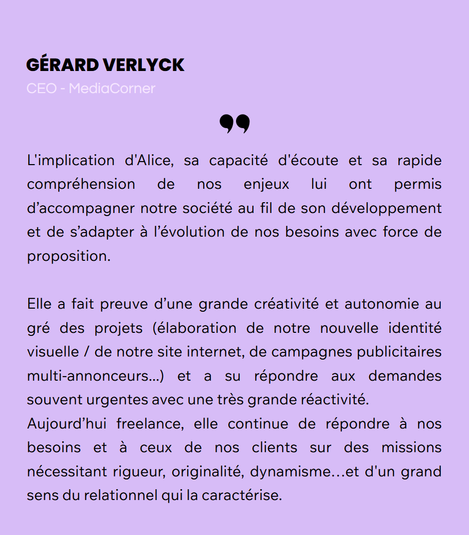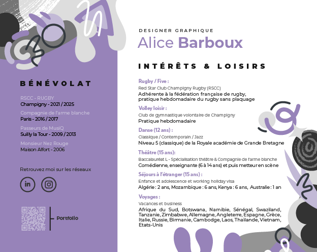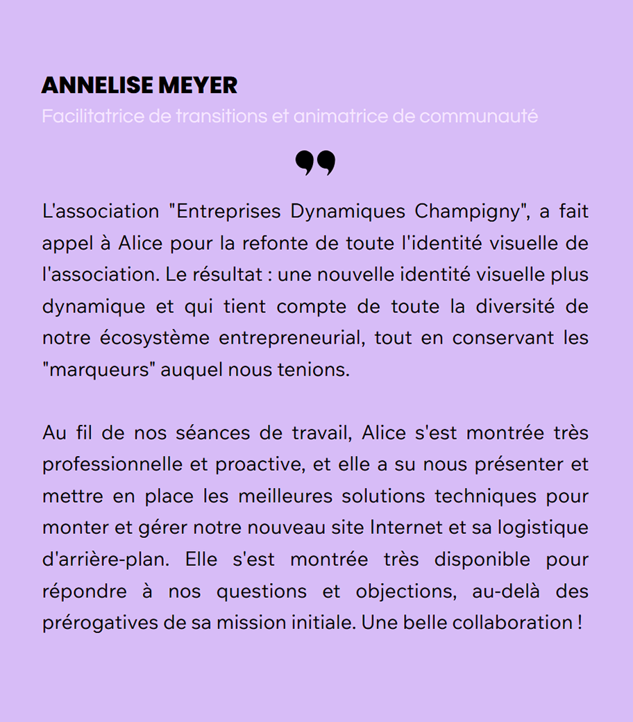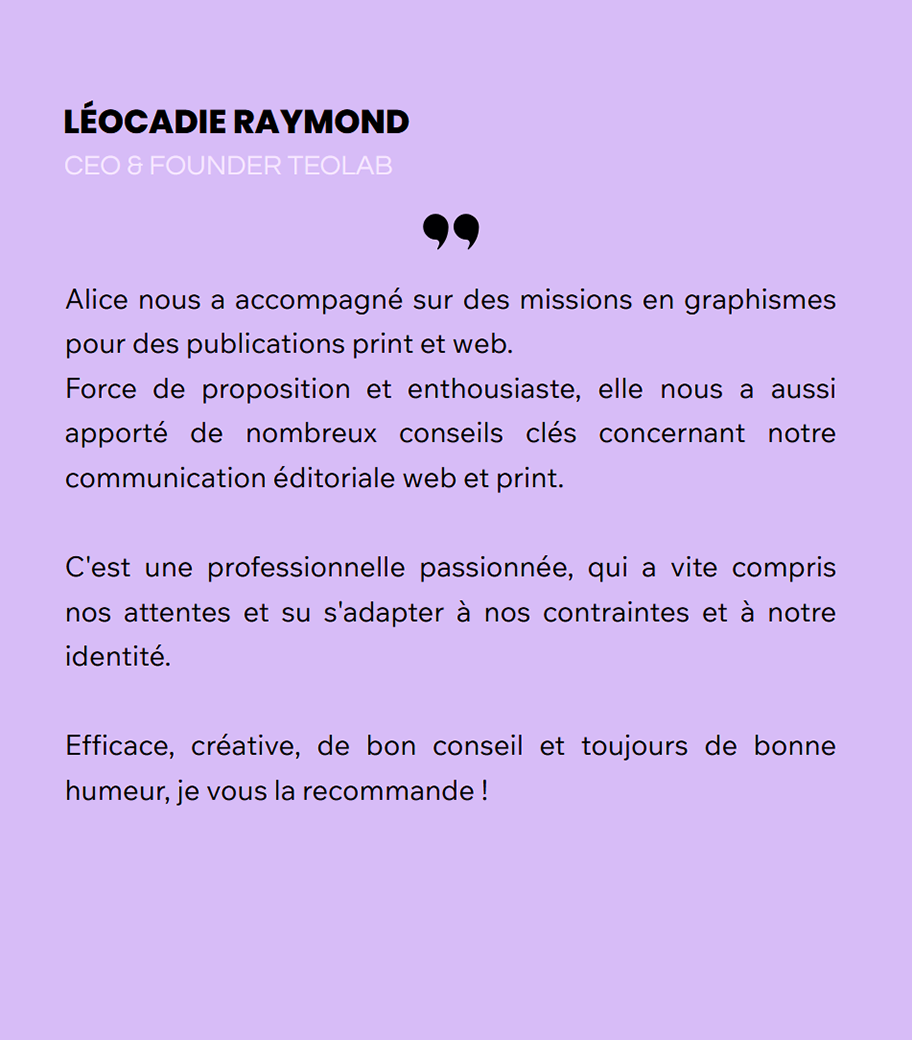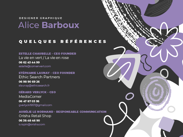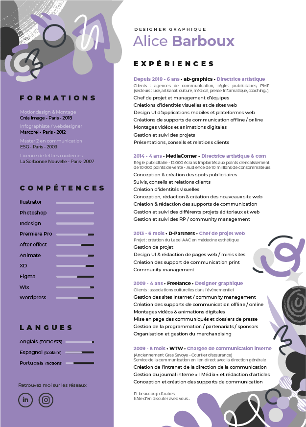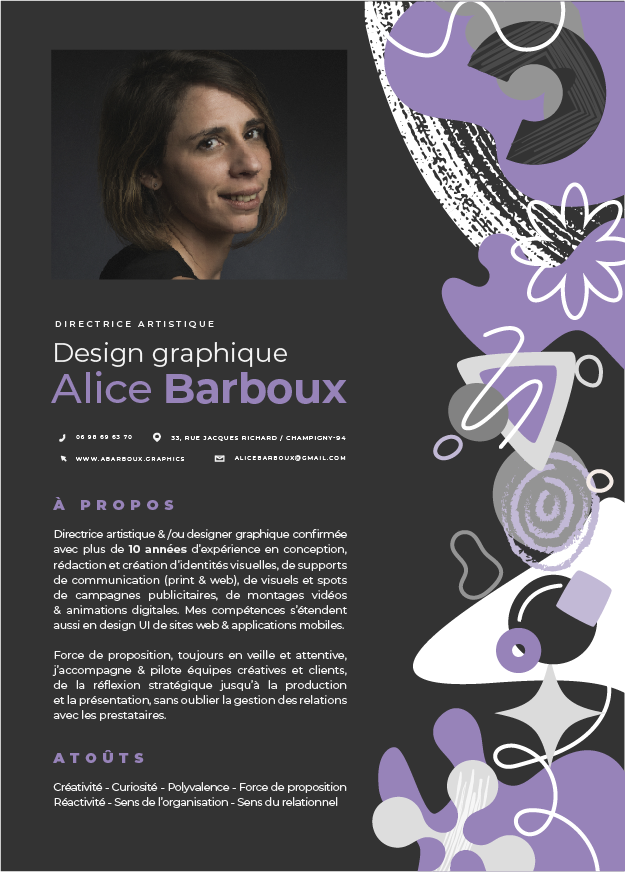 Designer graphique depuis 15 ans et diplômée d’un master en management de la communication, spécialisation communication visuelle ainsi que d'une formation d'infographiste webdesigner et de montage vidéo / motiondesign, mes domaines d’expertise conjuguent à la fois le graphisme web et print ainsi que la communication digitale et éditoriale.